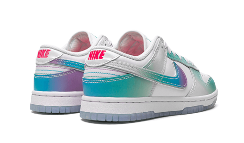 Always trendy, the Nike Dunk Low is back in a new colorway perfect for the season. This Nike Dunk Low Unlock Your Space features a white leather base, with leather overlays in a gradient of colors ranging from blue to purple to green. A Nike branding on the heel adds a touch of flashiness, matching the inner sole perfectly. Elevate your sneaker game with this stylish pair. Experience comfort and style like never before with the Nike Dunk Low Unlock Your Space.
