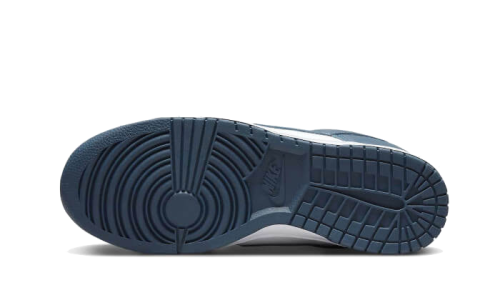 The Nike Dunk Low Valerian Blue features a white leather base complemented by overlays of navy blue leather. White laces blend into the tongue. A red embroidery adorns the heel, adding a touch of contrast to Peter Moore’s design.