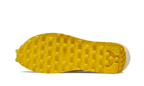The Nike LD Waffle Sacai Undercover Black Bright Citron features a black nylon base complemented by grey suede and white leather accents. A touch of bright lemon yellow adds a pop of color to elements like the Swoosh, inner lining, and outsole. The branding from all three collaborators is prominently displayed on the midsole, showcasing each label’s name.