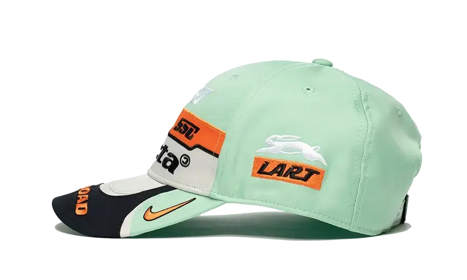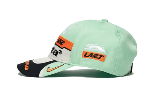 This Nike NOCTA L’Art de L’Automobile Club Cap is a standout piece for any streetwear collection. It features a vibrant color combination with hints of mint, orange, and black, capturing the spirit of auto racing. Bold logos and graphics reminiscent of sports car insignias adorn the front and sides, while the curved visor provides a classic style.
