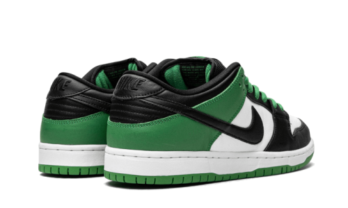 The Nike SB Dunk Low Classic Green features a white leather base, complemented by black and green leather panels with a similar pattern to the Court Purple edition. The usual branding can be found on the tongue and heel. A white midsole paired with a green outsole adds a touch of sophistication to the overall design.