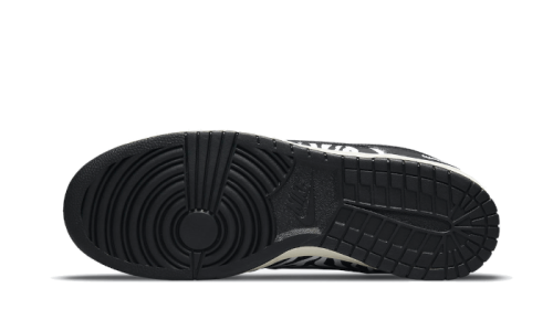The Nike SB Dunk Low Quatersnacks Zebra features a white base with a zebra print design resembling the frosting of the snack. It also includes black leather overlays and matching laces. The dual-colored co-branding is seen on the tongues, insoles, and heel embroideries. The vintage-inspired sole completes the look.