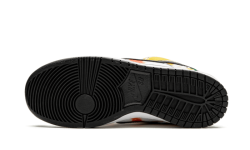 The Nike SB Dunk Low “Raygun” Tie Dye Away features a robust upper crafted from a light gray leather. The quarter panel showcases vibrant tie dye patterns in white, orange, and red, complementing the overall aesthetic. A small green logo is elegantly embroidered at the rear, coupled with the iconic swoosh and the Nike branding emblazoned on the heel, completing the look.